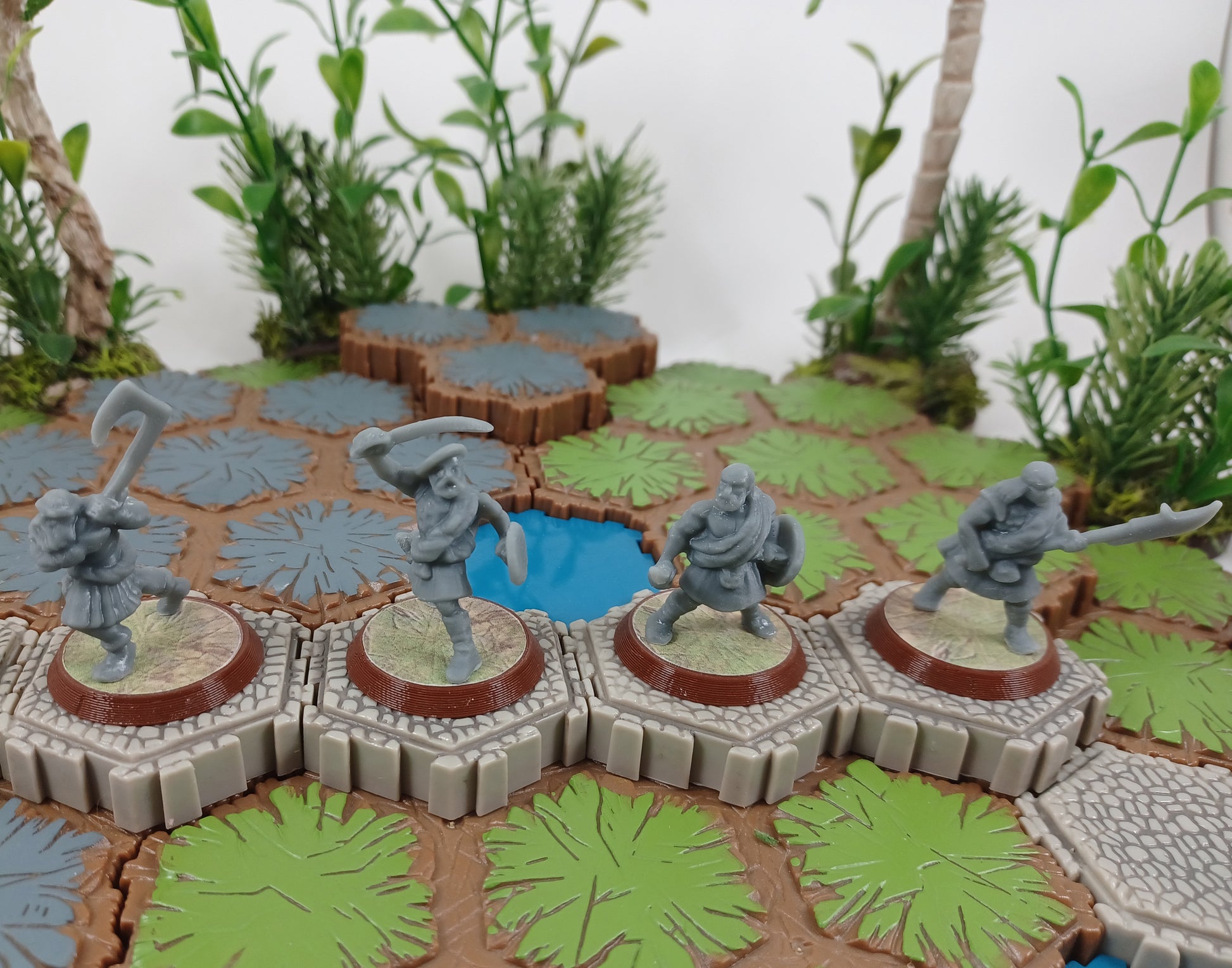 Resin 3D printed minatures for the Classic game Heroscape. The Resin is a tough ABS like blend to reduce fragility slightly. The brown bases are 3D printed with FDM filaments. The stickers are a premium Matte (Non-Gloss) Sticker material and are precisely cut with a CNC machine. The minatures, bases, and stickers are sent unassembled. An extra sticker is included with each squad.