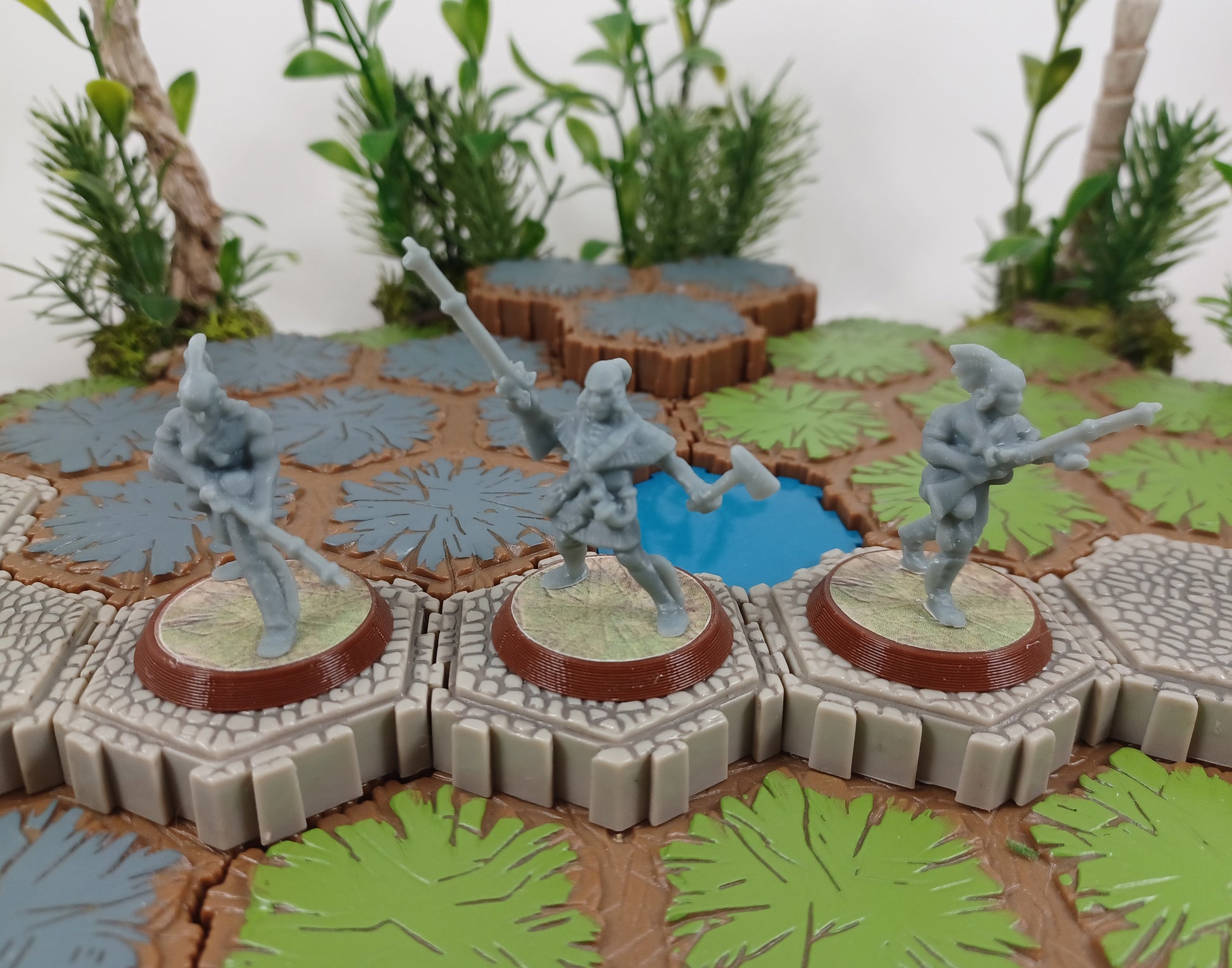 Resin 3D printed minatures for the Classic game Heroscape. The Resin is a tough ABS like blend to reduce fragility slightly. The brown bases are 3D printed with FDM filaments. The stickers are a premium Matte (Non-Gloss) Sticker material and are precisely cut with a CNC machine. The minatures, bases, and stickers are sent unassembled. An extra sticker is included with each squad.